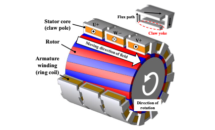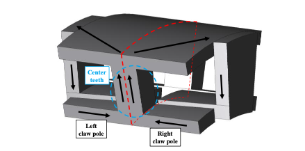 In the half-skew structure shown in Fig. 1, the axial length of the claw yoke increases, leading to significant magnetic saturation at the stator teeth under load. As shown in Fig. 2, the armature windings are axially segmented, and two claw poles with reversed flux paths are combined. This structure shortens the effective claw-yoke length and mitigates on-load magnetic saturation. Conventional and proposed structures are compared through three-dimensional finite element analysis in terms of flux density distribution and torque density.